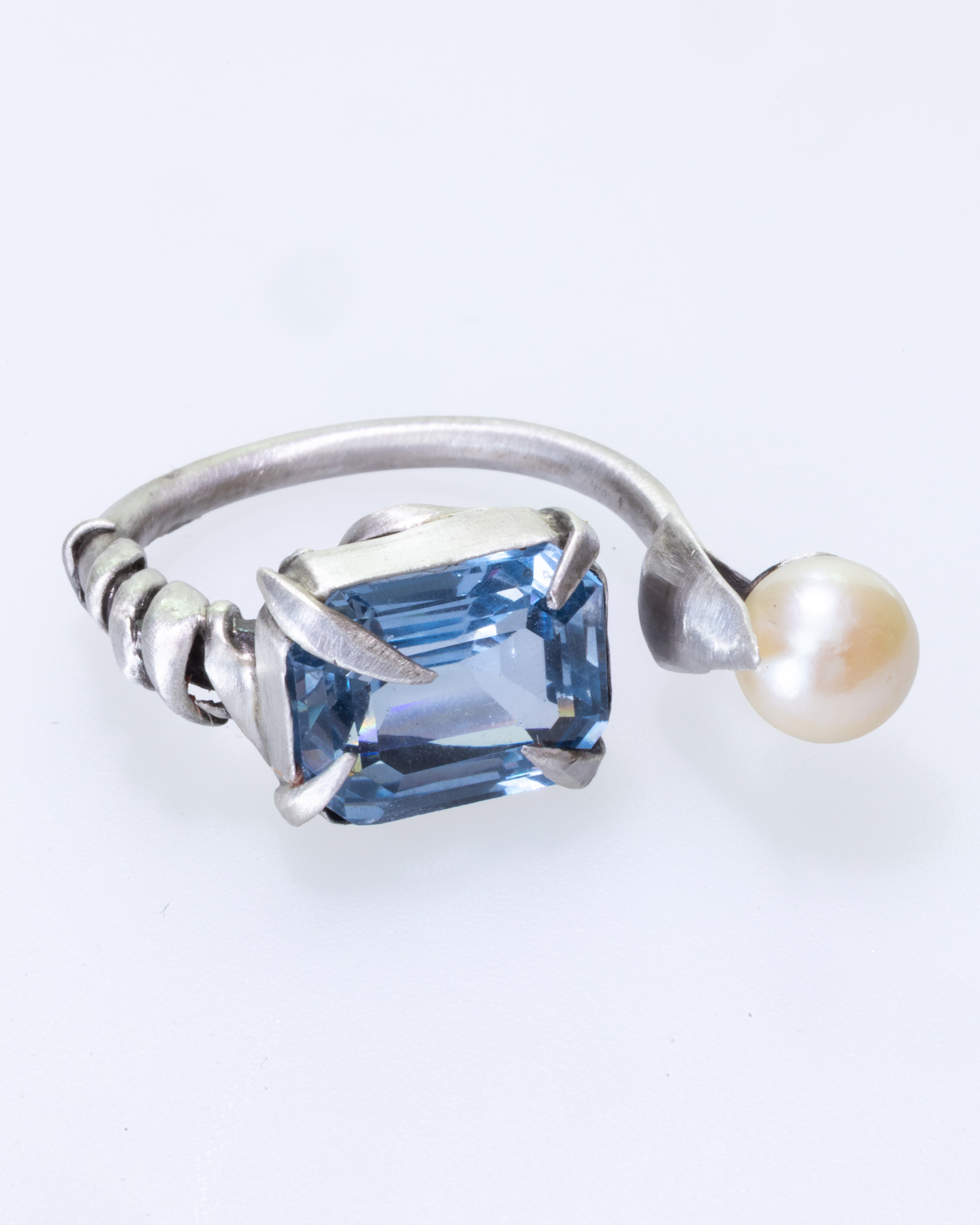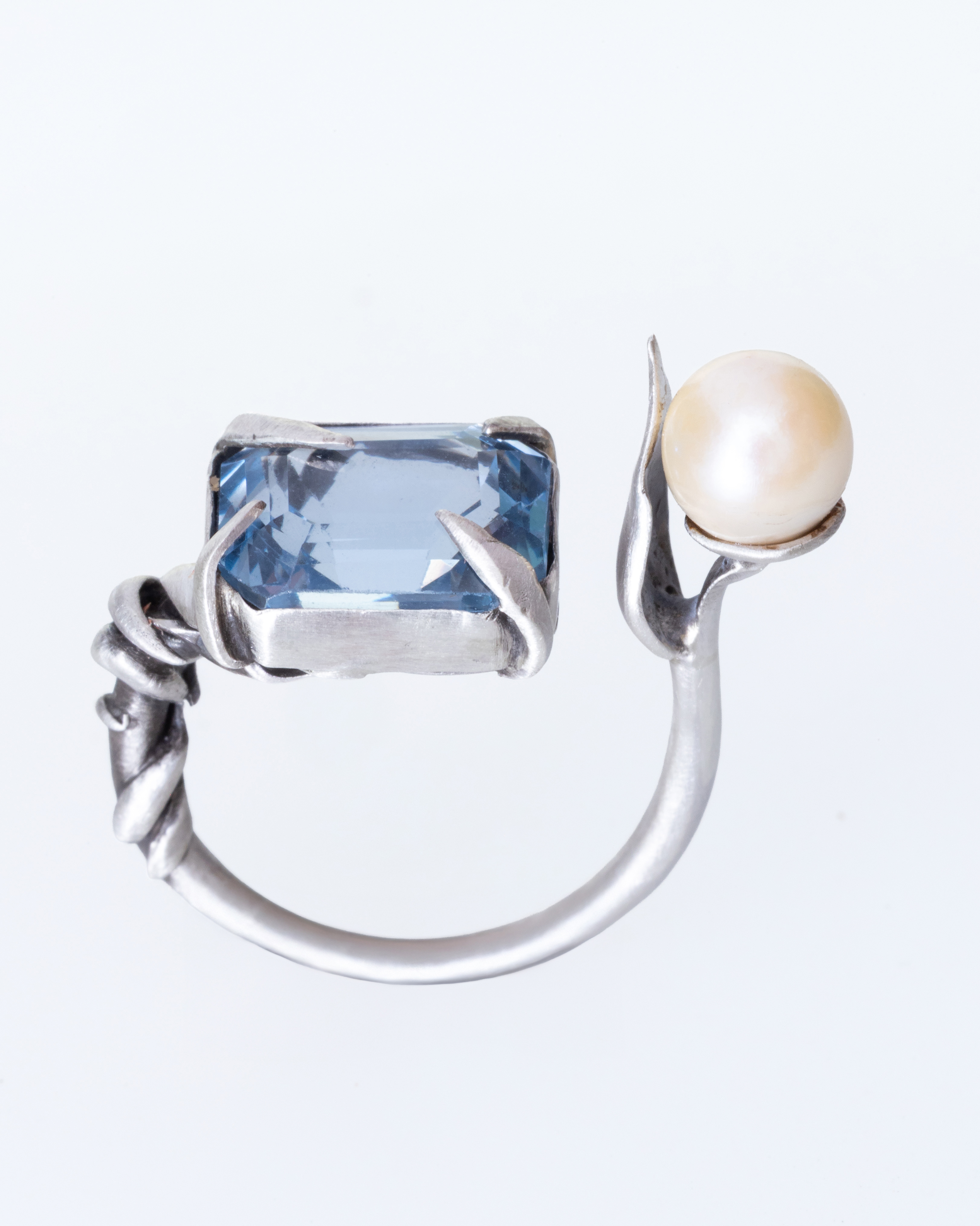 The depiction of this scene I tried to reflect in the ring I am presenting. The central stone, an aquamarine, stands for both the palely lit valley and the lake, as well as the casement of the dead woman, "open to the skies", like a window to the majesty of the scenery. The white pearl hangs over the aquamarine like the moon hangs above the valley, and along with the leaf surrounding it, it reflects a lily that leans over the surface of the lake. The rosemary is depicted in the floral details of the ring shank and the prongs that hold the aquamarine in place, which have organic and irregular shapes to be as natural as possible. The main body of the ring is made out of silver 925, symbolizing the cold undertones of the poem.