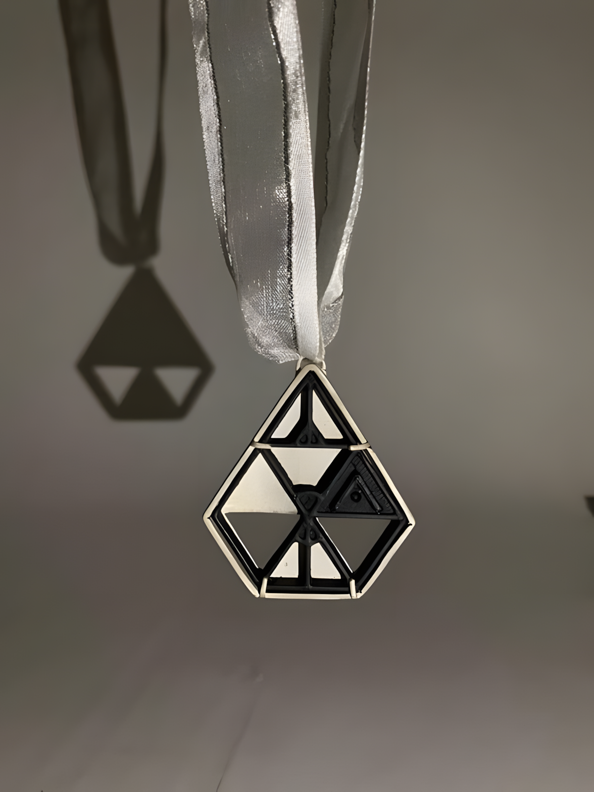 The resin cast is not completely solid and features negatives spaces. This allows for portions of the silver metal to be visible when looking at the medal from the front. This can be seen in the example drawing above where the darker shaded areas represent the metal that is visible. The setting its self also has negative space with two upsides down triangles pierced out this again can be seen as the pure white triangles on the example triangle. The use of negative space through out the medal is designed to create a sense of depth. The overall design and manufacture of the medal is structured in a way to represent techniques that are associated with fine jewellery as well as contemporary jewellery where there is freedom to be experimental hence the use of resin casting which gives the medal a balanced feel of luxury and artistry.