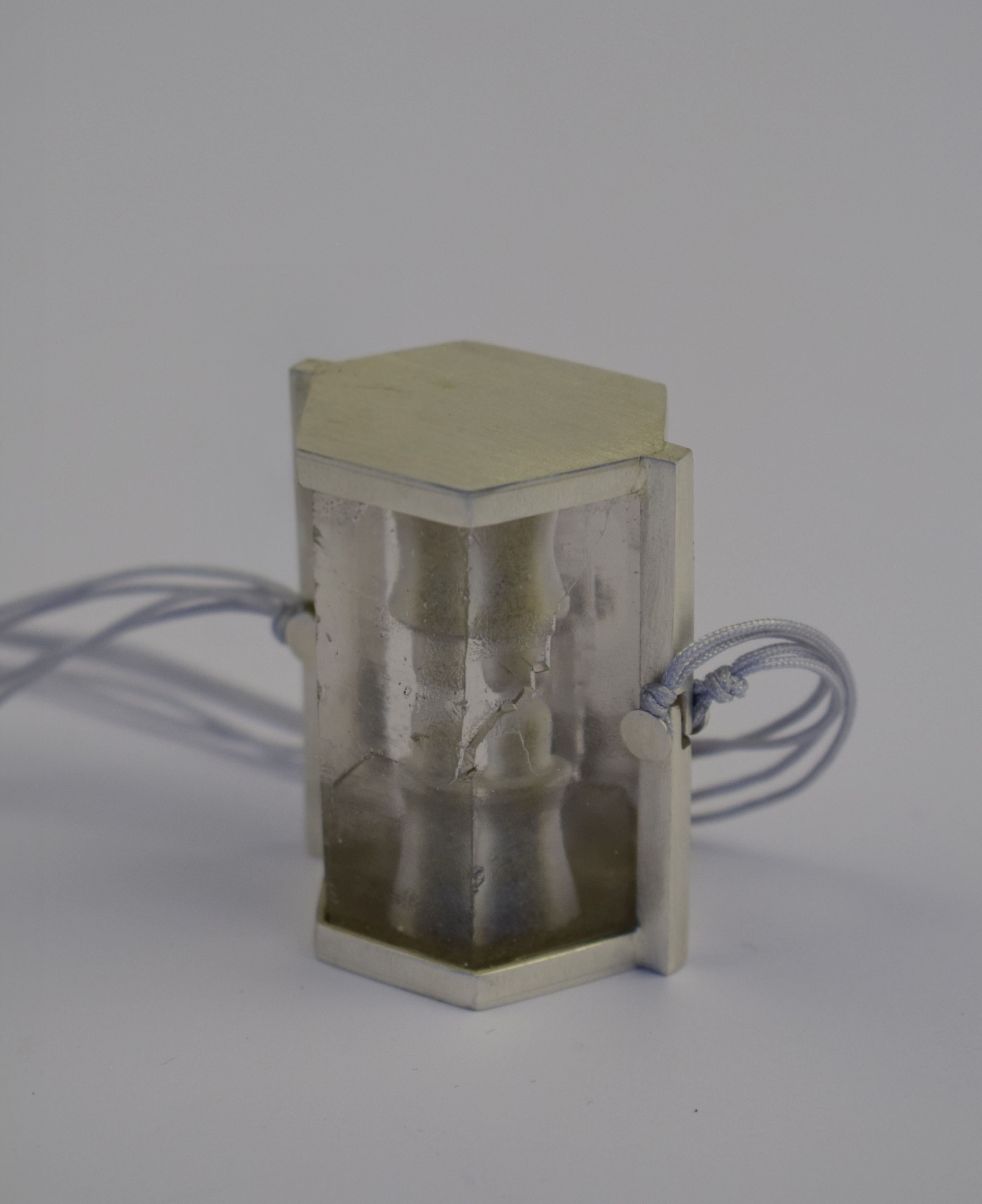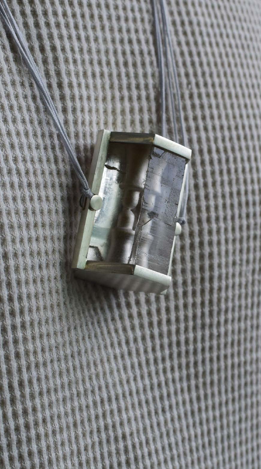 The rock crystal, which I cut myself, is polished on the outside and engraved on the inside with two symbolic figures. One of these is filled with silver dust, the other with amber. A small hole connects the two and allows them to be exchanged.