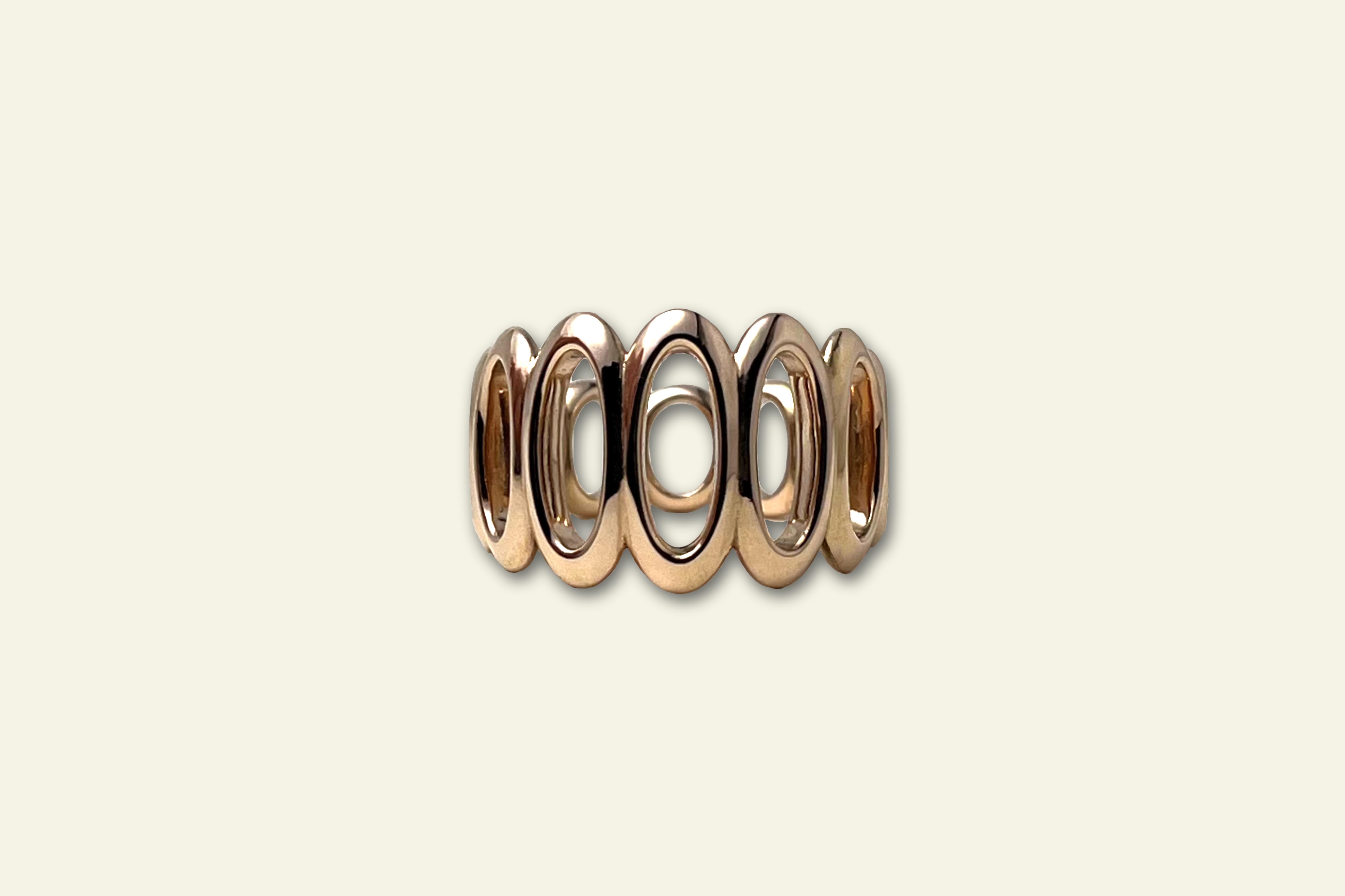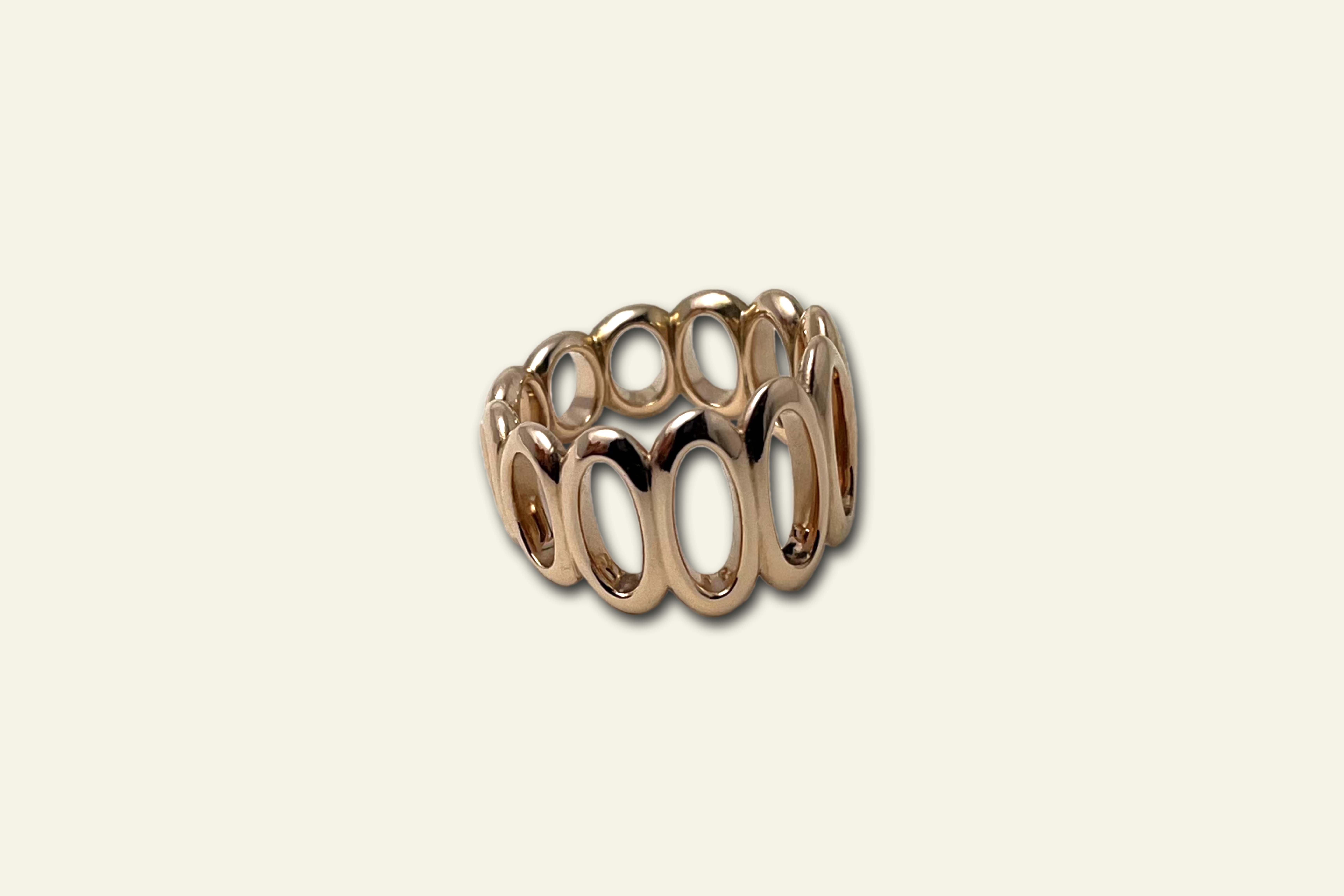 In its basic form, the ring resembles a eternity ring, as the shape, in this case a type of eyelet, is repeated several times in the first variations. However, as this type of ring lacks almost any tension, a solution had to be found to create some. This can be achieved by interrupting the rhythm, incorporating a variation in the shape, an irregularity, or a break. The rhythm of the ring was not changed, as all elements were left the same width, but the eyelets were transformed into ovals or hollowed-out and compressed ellipsoids. The ellipses all have a “frame” of equal width and are conical in shape, so that on one side, the narrowest point, they almost form a circle again.